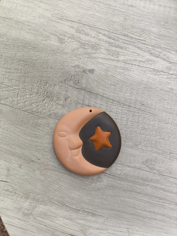 Pieza artesanal modelada y esmaltada a mano, que representa la armonía entre la Luna y la Estrella, símbolos de luz, guía y conexión con lo celestial.