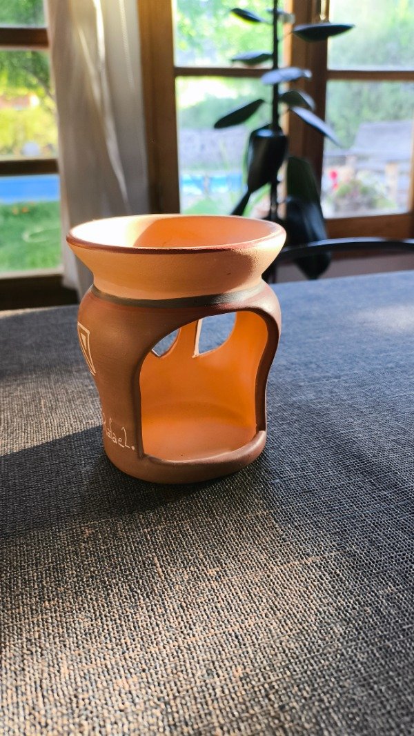 Hornillo artesanal de cerámica, diseñado para aromaterapia y ambientación natural. Cada pieza es modelada y esmaltada a mano, con un acabado rústico y cálido que resalta la belleza del barro cocido.
