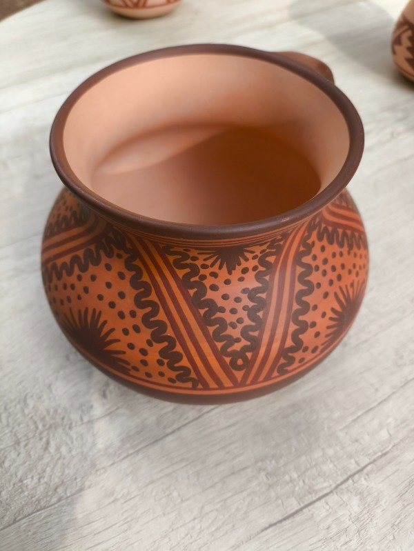 Pieza artesanal elaborada en cerámica modelada y pintada completamente a mano, inspirada en los diseños simbólicos de las culturas originarias andinas.