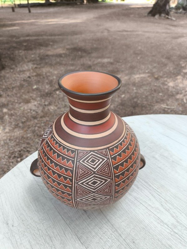 Su acabado en tonos terracota, negro y crema realza la textura del barro cocido y resalta el trabajo minucioso del artesano.