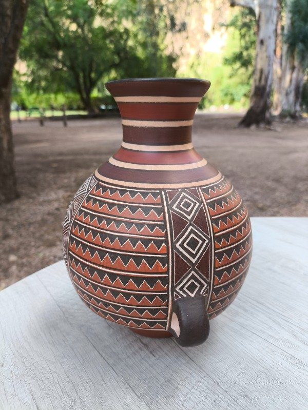 Obra artesanal única, modelada y pintada completamente a mano, inspirada en los motivos geométricos del arte andino ancestral.